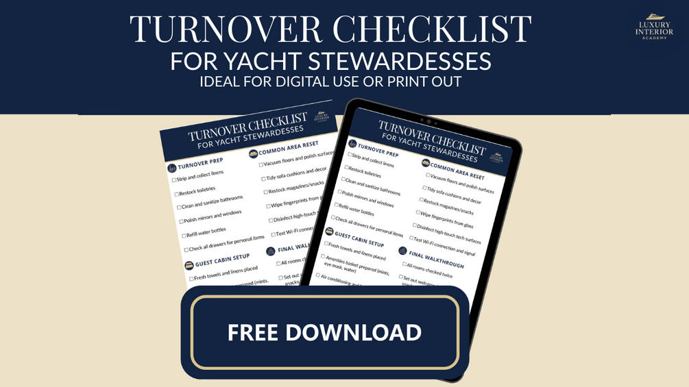 This Turnover Checklist for Yacht Stewardesses gives you a clear, foolproof system to refresh guest spaces, reset common areas, and prepare for new arrivals like a 5-star hotel crew.