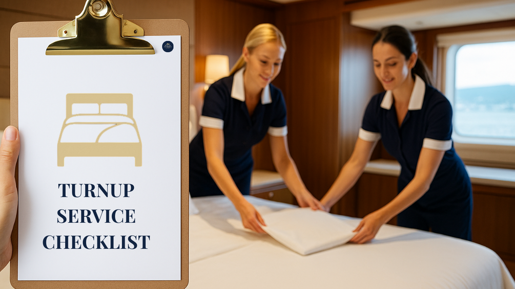 Start every guest’s day with flawless precision. The Turnup Service Checklist is designed to guide crew through the morning or daytime refresh of guest suites, ensuring every detail is perfect and consistent with luxury standards.